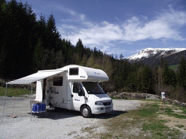 Freitag 27.4.2012 So, wir sind in Österreich!! Kaiserwetter !!! Wir sind schon um 5.30 h wachgeworden, weil wir im frühen klaren Morgenlicht die Drei Zinnen und das Bergpanorama genießen ( und knipsen ) wollten. Also wieder fix alles erledigt und los gehts. Wir fuhren von Auronzo di Cadore nach Misurina. Misurina ( auf 1755 m Höhe) ist ein kleines Juwel, die schneebedeckten Berge, der See, einfach majestätisch. ( Fotos ) Von da ging es dann weiter nach Toblach, die Aussicht war die ganze Zeit überwältigend. Wir sind dauernd am Strassenrand stehengeblieben und ich habe fotografiert. Es werden wohl einige Autofahrer hinter uns geflucht haben. Was solls, wer weiß, wann wir noch einmal die Gelegenheit haben hierher zu kommen. Von Toblach aus ging die Fahrt die Pustertalstrasse entlang über die österreichische Grenze nach Lienz, dann über Matrei ( rechts und links Großvenediger und Großglockner , Wahnsinn ) in den Felbertauerntunnel ( 5,3 km - € 10,00 Maut ) und von da aus bis Mittelsill. Hier fuhren wir dann nach links in den Pinzgau nach Neukirchen am Grossvenediger. Im Bordkatalog fanden wir hier die Adresse das Gasthofes Friedburg im Ortsteil Rosental hoch oben über dem Salzachtal gelegen. Übernachtung mit Strom und VE/Wasser € 8,50. Als zahlender Gast im Restaurant sogar die Nacht umsonst . Wir wurden sehr liebenswürdig vom Gastwirt begrüßt, der Stellplatz ist von der Lage her einzig. Dieser Fernblick weit ins Tal und die Almen, die hohen weißen Gipfel des Großvenedigers, die vorbeifahrende Eisenbahn unten entlang der Salzach sieht wie eine Märklin von hier oben aus. Es ist ein wundervolles Plätzchen. Ein himmlische Ruhe hier oben, drei Häuser und eine kleine Kapelle. Alles propper und jede Menge Wanderwege rundum, direkt vor dem Womoplatz beginnt der Wald. Wir sind total happy, dass wir das hier gefunden haben und wollen auf jeden Fall ein paar Tage bleiben, zumal die Sonne heute den ganzen Tag vom wolkenlosen Himmel schien und wir tatsächlich zum ersten Mal die Markise brauchten. Ich habe "kleine Wäsche" gewaschen und draussen am WC-Fenster aufgehangen, wie bei Hempels... :))) Es trocknete ratz-fatz und roch gut nach frischer Luft. Morgen werden wir dann den inneren Schweinehund überwinden und unsere Wanderschuhe anziehen und die Gegend erkunden, normal sind wir ja recht faule Wandersleut. Der Diesel ist hier in Österreich um die 30 Cent günstiger als in Italien. Erfreulich !!:))