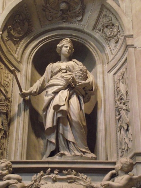 Im übrigen fand ich die Statue einer Frau mit einer Papstkrone ( Tiara ?) im Arm, vor einigen Jahren erzählte uns ein Fremdenführer, dass es sich um die sagenumwobene Päpstin handeln würde. Keine Ahnung, jedenfalls ist es schon erstaunlich, dass da im Dom überhaupt eine Frau , außer als Anbetende oder knieend Trauernde oder als die Pieta mit dem sterbenden Jesus auf dem Schoß Zugang hat.