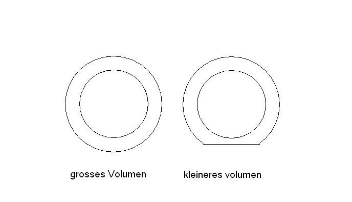 Wieso wird das Volumen des Reifens im belasteten Zustand kleiner? Das liegt daran, dass der Reifen im unbelasteten Zustand die Form annimmt, die seinem groessten Volumen entspricht. Jede Verformung durch Belastung wird also zu einem kleineren Volumen fuehren.