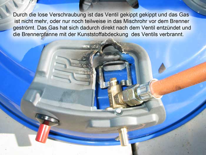 Das Gas hat sich dadurch direkt nach dem Ventil entzündet und die Brennerpfanne mit der Kunststoffabdeckung des Ventils verbrannt. (siehe Bild)