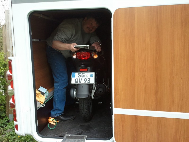 Aber in schmaleren Wohnmobilen lassen sich die knapp 2 Meter auch verstauen, wenn man den Roller etwas schräg stellt.