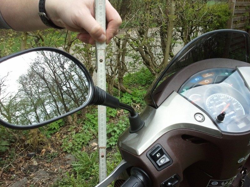 Das Topcase muss ab, geht aber ohne Werkzeug, nur mit dem Zündschlüssel. Die Spiegel werden quer gedreht und so waagerecht wie es geht geklappt. Mein Daumen am Zollstock ist weiter bei 123cm und man sieht, das die Türe augenscheinlich schon zu klein für den Roller ist, die Spiegel mit 130cm dürfte also Illusion sein.
