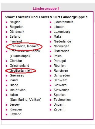 Im Tarifgebiet 1 ist GB und F dabei. Und richtig, es ist eine Flat die selbst nach der Drosselung (>100MB) noch zu gebrauchen ist :wink: Die Drosselung beläuft sich IHMO auf 360KBit. peter Hallo Peter,