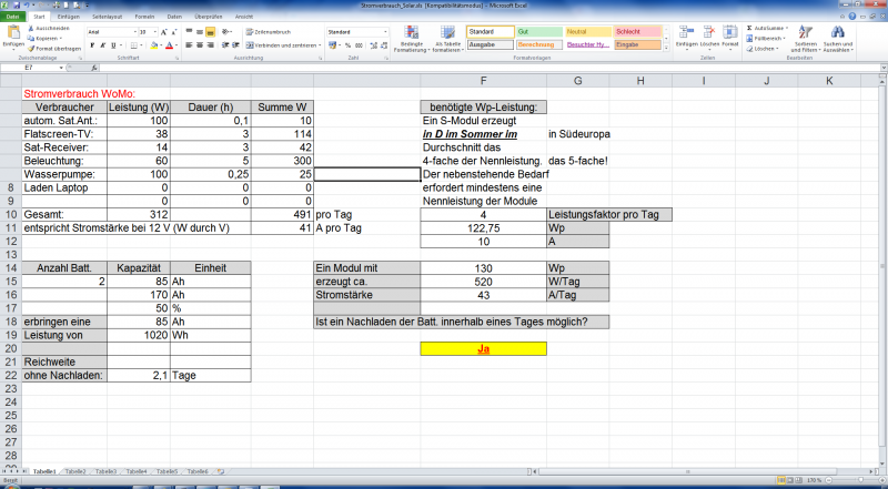vor einer ähnlichen Situation stand bzw. stehen wir auch. Das neue Mobil kommt (hoffentlich) Ende Mai und hat 2 mal 85 AH an Bord. Solarverkabelung ab Werk liegt ebenfalls. So weit, so gut. Die Frage 'Wie viel soll nun der Solarteil leisten?' habe ich mir gestellt und die Antwort ist - wie hier auch zu lesen - immer gleich: ermittle Deinen Verbrauch in Watt, rechne ihn zusammen, teile Watt durch Volt und Du erhälst die Ampere, die du verballerst. Und dann habe ich irgendwo in den Tiefen des Internets eine Excel-basierte Liste gefunden, die für den Otto-normal-Wohnmobilist Musterwerte enthält. Diese habe ich genommen und mit ein paar anderen Informationen verbunden, habe der Tabelle das Rechnen und logische Denken beigebracht und jetzt sagt sie mir, ob die Solarleistung ausreicht (bei angenommener Sonneneinstrahlung und gegebenem Verbrauch), die prognostizierte Entladung eines Tages wieder auszugleichen :eek: . Hier eine Hardcopy davon: