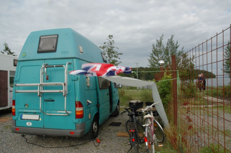 hab auch keine Markise. Ich wollte nicht so viele Löcher in meinem kostbaren Hochdach haben. Stattdessen habe ich ein Tarp von 3m x 3m und zwei Zeltstangen dazu. Das kann ich recht flexibel aufbauen, ist allerdings Bastelarbeit. Hier mal ein Bild von der per Tarp beschatteten Idylle am Stellplatz in Lauterbach auf Rügen: