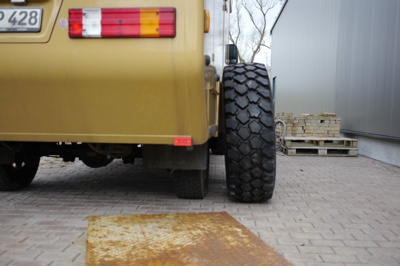 Die Vorderachse ist eine Außenplanetenachse mit Parabellfedern, die Hinteachse ebenfalls Außenplanetenachse mit Luftfederung. Bereifung: 395/85 R 20. Die Luftfederung haben zugunsten des Komforts gewählt, auch wenn dadurch die Achsverschränkung leidet. Die Hardcorefraktion wird natürlich auch die höhere Störanfälligkeit anführen, aber an unseren o.g. Reisezielen sieht man, dass wir nicht unbedingt auf die beschränkten Möglichkeiten einer Werkstatt im Busch mitten in Schwarzafrika angewiesen sind. Bei allen Offroad-Fähigkeiten wollten wir aber auch Fahrkomfort auf befestigten Straßen, auf denen wir bei realistischer Betrachtung mehr als 90 % der Strecken fahren.