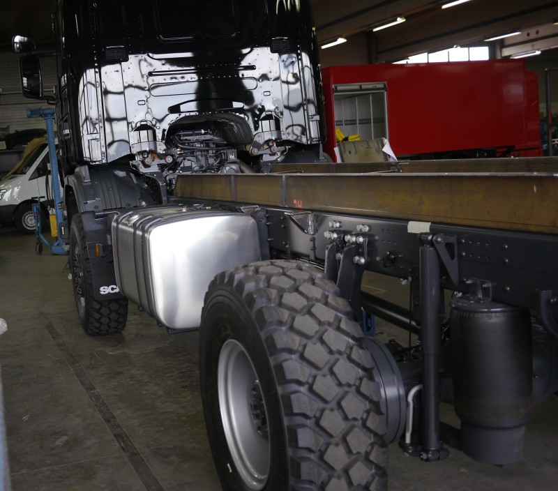 Die Konstruktion mit Rahmen, Hilfsrahmen und Kabine unterscheidet sich bei einem Allrad-LKW grundsätzlich von einem normalen Integrierten.