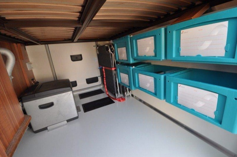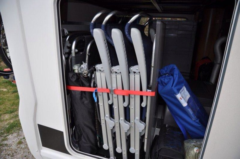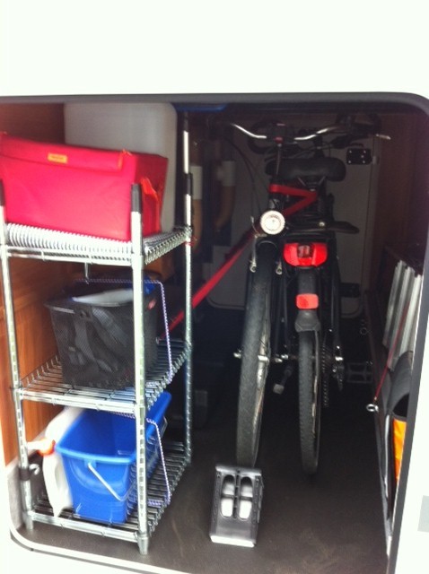 manchmal sind wir so vorausschauend und positionieren Schuhe oder Wasser so günstig, dass wir über die Klappe, die vom Innenraum einen kleinen Durchlass in die Heckgarage gewährt, bequem an solche Dinge drankommen (besonders praktisch ist die Klappe für die Schmutzwäsche, die fliegt direkt in den Wäschekorb). Aber leider nur manchmal. :D Denn oft genug denken wir nicht daran, und dann muss sich einer erbarmen und raus in Matsch und Regen (dafür deponieren wir immer ein Paar draußen-Crocs im Mobil). GENAU SO :D Apropo Po Klo ...... Sch... auf die Kassette oder das Papier in der Garage, wie schwer haben die es erst.