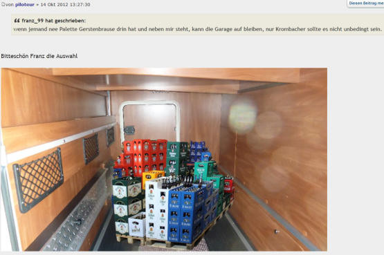 ... von rechts hat sich nichts geändert. MfG Steffen Bei uns kommen wir jetzt rechts an Bier und Wasser, links an Wein und Sekt. So sah es mal aus ![]() Normalerweise trinken wir kein Plastikbier, aber hier war Peter zur Kur und ich musste die Getränke selbst schleppen. Hallo Christel, kannste denn nicht mal die Garagentür zu lassen? Wer weiß, welcher Stellplatznachbar daran Anstoß nehmen könnte....... :roll: Volker :wink: Damals war aufgeräumt :D Aber für Vegetarier und Antialkoholiker war wohl zuviel Leckerschmecker drin :lol: Ist doch nicht schlimm - für den ersten Tag braucht man unterwegs ja ein wenig auf Vorrat.... :D