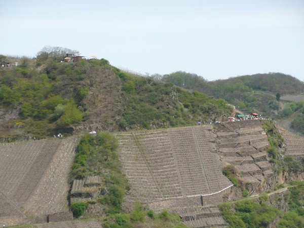 Und während wir so am Wasser die Ruhe genießen, grölen gegenüber hoch oben auf dem Weinberg vier Menschen, und veranstalten seltsame Bewegungsübungen.