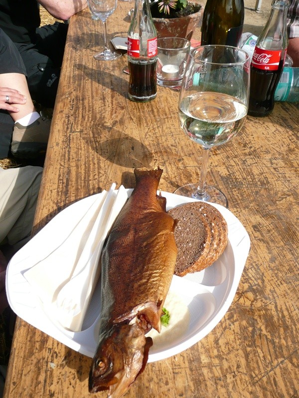 Wir erscheinen natürlich wieder mal als letzte zum Frühstück, das bei strahlendem Sonnenschein draußen stattfindet. Gestern hätte niemand gedacht, dass es heute so ein Sommerwetterchen gibt.