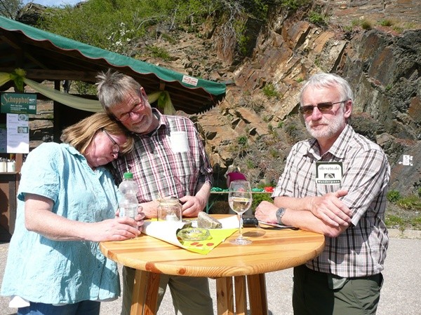 Wunderschönes Sonntagswetter, aber nicht mehr so heiß wie gestern. Also entschließen wir uns die Wanderung in Richtung Mayschoß mit Uschi und Dieter zu wagen. Wiebke macht heute einen Lesetag, und Konrad fährt mit dem Rad zum Rhein.