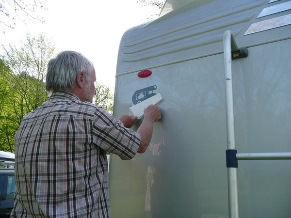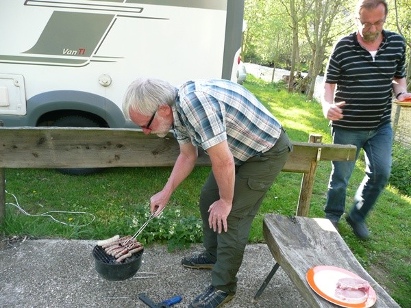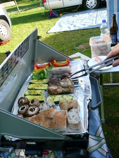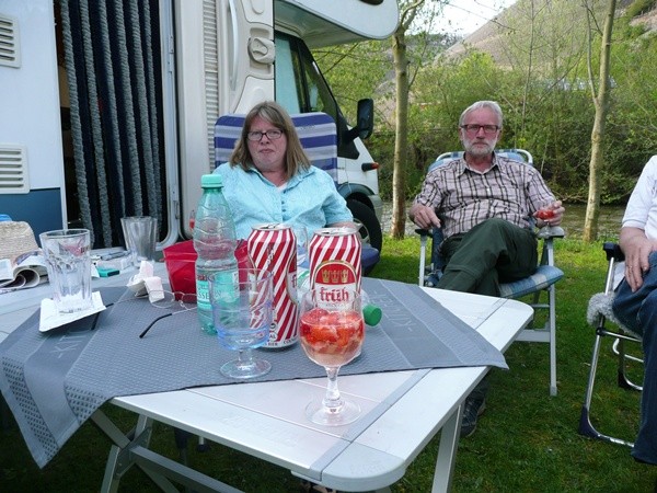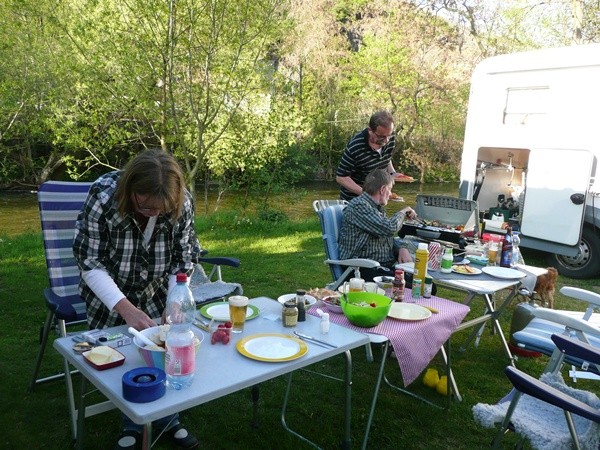 Nachdem alle eingetrudelt sind und die Wagenburg steht, genießen auch wir den ersten Urlaubsabend. Allerdings wälzen wir uns nicht, sondern sitzen gesittet unter Konrads Markise. Es regnet nämlich. Aber macht nix, wir sitzen trocken und befeuchten uns ein wenig innerlich.