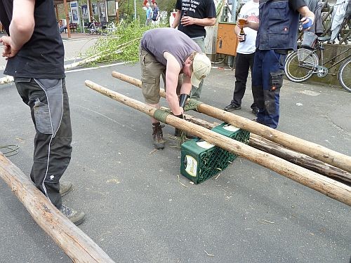 Dieses Maibaumstellspektakel wollen wir uns nicht entgehen lassen, denn hier wird er nicht per Feuerwehrkran, sondern mit "Manneskraft" aufgerichtet. Dazu stärken sich die Jungmänner mit reichlich Bitburger, während die Mädels am Bahndamm sitzen und ihnen dabei zusehen.