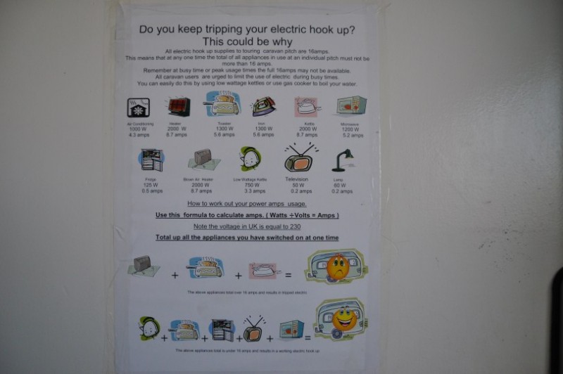 Elektrik, 10 oder zumeist 16 A abgesichert, allesamt für blaue Euro-Stecker; meinen mitgebrachten GB-Adapter habe ich nicht einmal benötigt;