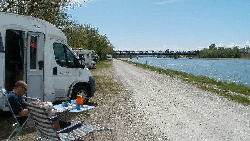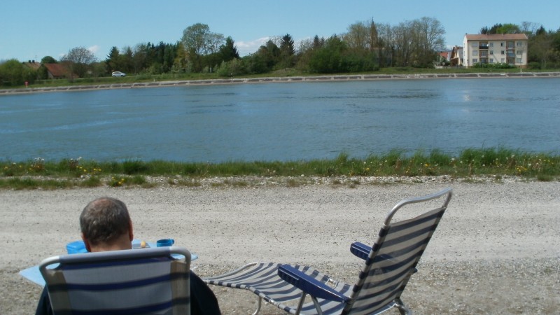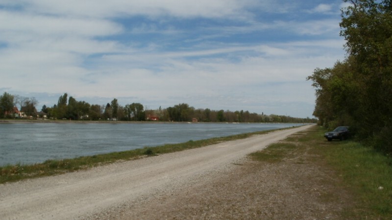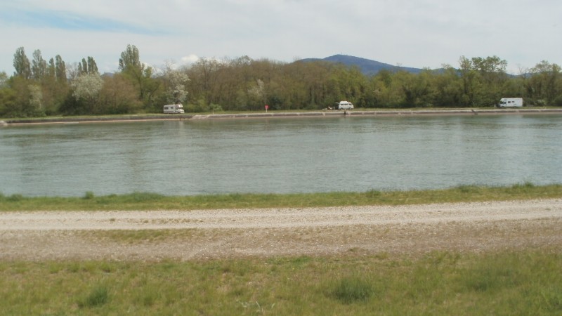Von der deutschen A5 Ausfahrt Müllheim / Neuenburg nur 1 Km entfernt ! Also auch ideal als Zwischenübernachtung oder Pause , kurz vor oder nach Basel. Richtung F-Chalampé fahren und zwischen Altrhein und Rheinkanal ist auf der Insel ein Parkplatz unter 3,5 t. Anschliessend kommt eine Schotterstrasse direkt zum Rheinkanal.Ohne Gewichtbegrenzung ! Genug Platz in beide Richtungen zum Parken . Genau gegennüber des Ortes Chalampé. Am Ortseingang ist übrigends gleich ein Intermarché mit Tankstelle! Einziges Manko , Baden verboten wegen starken Strömungen! Also Kinder und Hunde "festbinden". Plätze sind eben und geschottert ! Eine Wohnmobilbesatzung hat auch geangelt . Ein ganzes Stück weiter auf der Insel gibts ein Golfplatz: Golf du Rhin . Kein Strom und V/E ! Wegen PC Problemen hab ich jetzt nur das eine Photo :