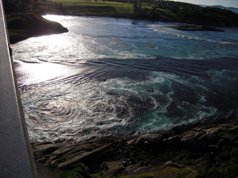 auf dem Weg vom Saltstraumen zum Troghattan fahrt Ihr zwangsläufig am Svartisen vorbei. Es gibt einen Parkplatz, von dem aus die Boote zum Gletschersee fahren, dann noch ein paar Kilometer laufen und Ihr steht am Gletscher. Wenige Kilometer nach dem Svartisen gibt es einen schönen CP in Foroy, nahe an der Fähre. Blick von der Strassenbrücke auf den Saltstraumen bei Ebbe. Die Strudel haben einen Durchmesser von ca. 10 m