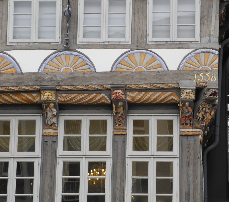 Von der Osterstrasse ist das Bild oben. Es zeigt das Stiftsherrenhaus und Leisthaus (jetzt Museum). Der Ausschnitt unten ist vom obrigem Stiftsherrenhaus, er zeigt die schönen Schnitzereien am Fachwerk, mit der Jahreszahl von 1558