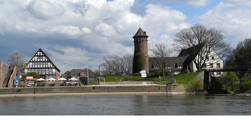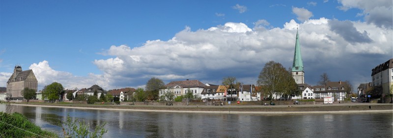 Ein kurzer Weg über die Weserbrücke, schon ist man in der Stadt, rechts von der Brücke wie im Panorama zu sehen, der alte Hafen. Dazugehörend, das alte Pfarrhaus. und die Jugendherberge mit dem trutzigen Turm.