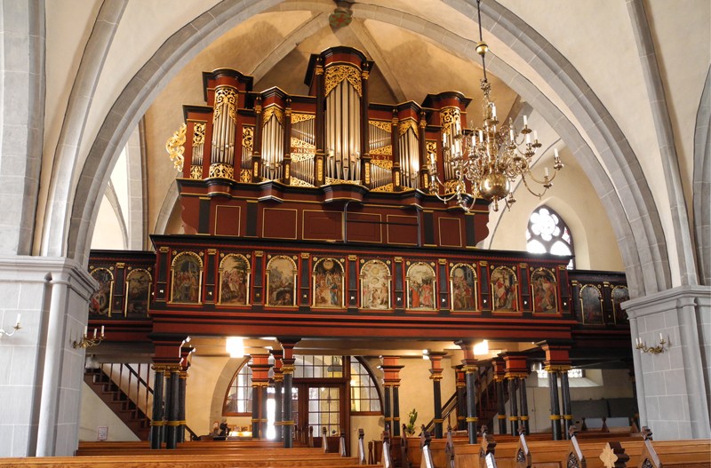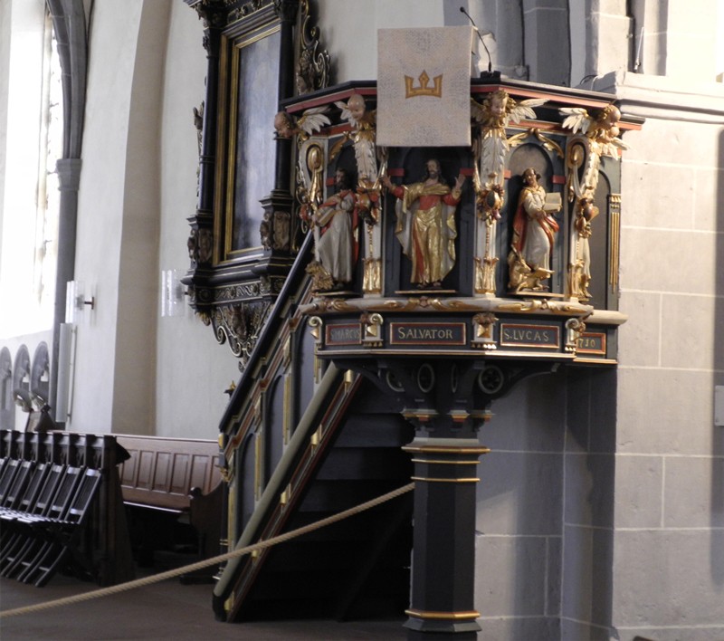 Oben das Bild von der Empore mit der Orgel, unten die Kanzel der St. Nikolai-Kirche.