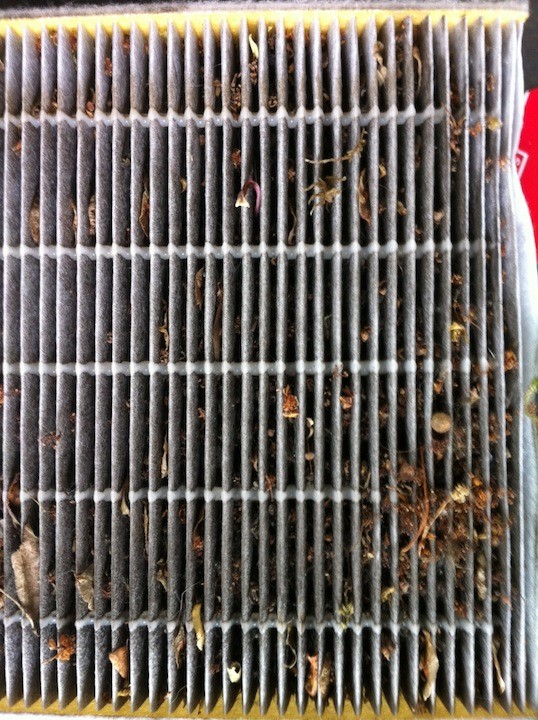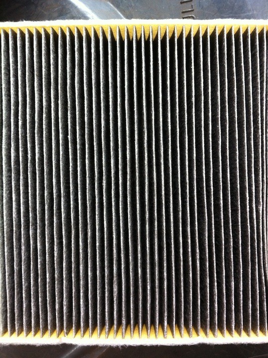 Das Papierfilter nennen sich eigentlich "Frischluftfilter". Das Aktivkohlefilter filtert die Pollen wesentlich besser aus der Luft. Wenn man stundenlang hinter dem Steuer sitzt, werden die im Womo befindlichen Pollen durch das Gebläse nach hinten gedrückt und der Luftstrom vom Gebläse drückt ja ständig frische Luft ins Fahrzeug (Gesicht). Von daher ist das Filter mit Aktivkohle schon von Vorteil. Das Filter sollte schon einmal im Jahr kontrolliert werden. Hier mal ein Filter der 12 Monate im Einsatz war. Rückseite