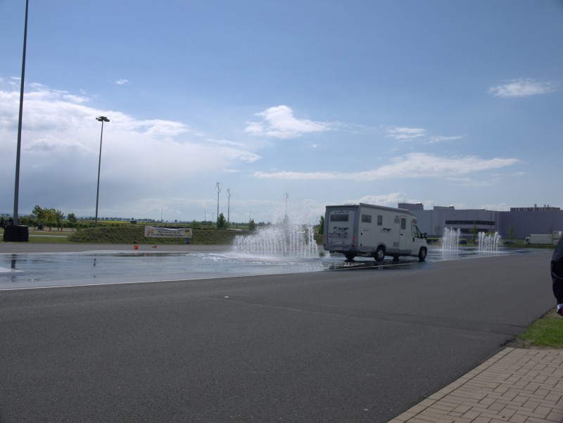 Bei mir hat die Praxis zu einigen Aha bzw. besser Oha-Erlebnissen geführt und ich kann dieses Training daher nur weiterempfehlen. Ich möchte behaupten, auch diejenigen, welche meinen, ihr Fahrzeug zu beherrschen, bekommen etwas zum Nachdenken. Positiv ist die kleine Gruppe hervorzuheben. Fünf Fahrzeuge und sechs Fahrer erlaubten für jeden ausreichende Trainingszeit. Jeder Parcours konnte mehrere Male durchfahren werden, sodass man wirklich die Grenzen des Möglichen ausloten konnte. Die Theorie beschränkte sich auf "Was man weiß, was man wissen sollte" hinsichtlich Beladung verzurren, Gewichtsverteilung im Fahrzeug, Schränke und Kühlschrank, Fenster und Dachluken etc. und müsste jedem Wohnmobilfahrer bekannt sein. (Der letzte Halbsatz gilt natürlich mit Einschränkung :roll: ). Hier erwartete unser Trainer, Herr Carsten Meyer-Haßfurther :smilingplanet: (hier schon mal ein ausdrückliches Lob für die Ausführung des Trainings), auch die Mitarbeit der Teilnehmer durch intensives Fragen und Diskutieren. Die meiste Zeit jedoch verbrachten wir auf der Platte zur Praxis. Leerlauf gab es keinen, da auch das Beobachten der anderen Kursteilnehmer inklusive der launigen Kommentare unseres Trainers sehr lehrreich waren. In der Praxis gab es fünf Trainingseinheiten. Die erste war das Fahren in engen Kehren und einer Slalomstrecke, die mit minimalen Lenkbewegungen bei größtmöglicher Geschwindigkeit zurückgelegt werden sollte. :sport: Originalton Trainer: "Wehe es fliegt ein Hütchen oder wird überfahren und der Trainer muss es wieder aufstellen. Das gibt Punktabzug." Danach Notfallbremsung auf nassem Asphalt vor stehendem Hindernis. Hier konnte man schon merken, wieviel plus/minus 5 kmh schon ausmachen. :onceldoc:
