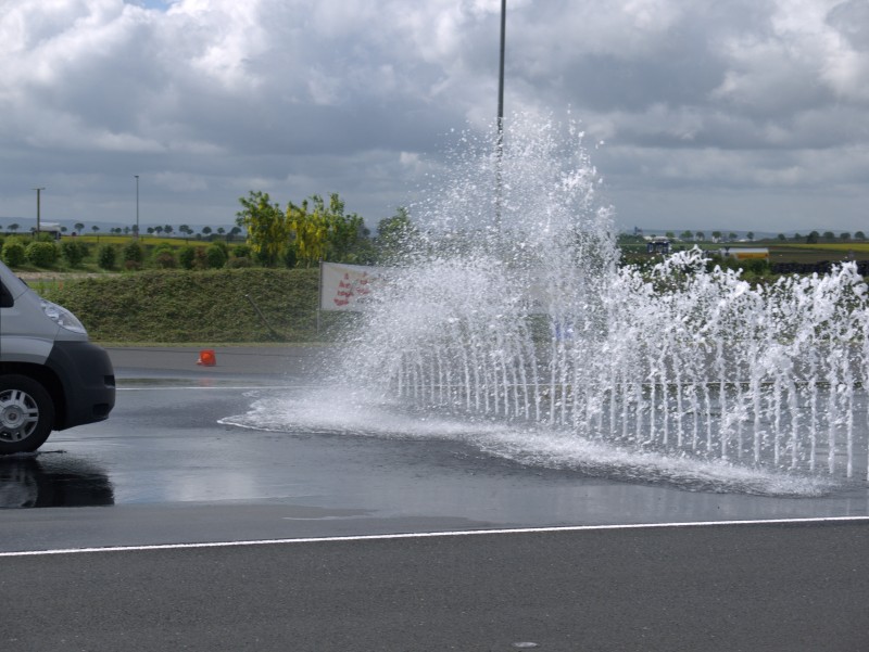 Zum Schluss gleiche Stahlplatte, mit Ausweichlücke in der (Wasser-)Wand "zufällig" durch den Trainer ausgewählt. Es galt mit Vollbremsung (wohl dem der ABS hatte) und sanfter Lenkbewegung auf den Standstreifen oder die freie linke Spur auszuweichen. (Dorotee und Uwe könnten dazu auch etwas erzählen)