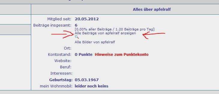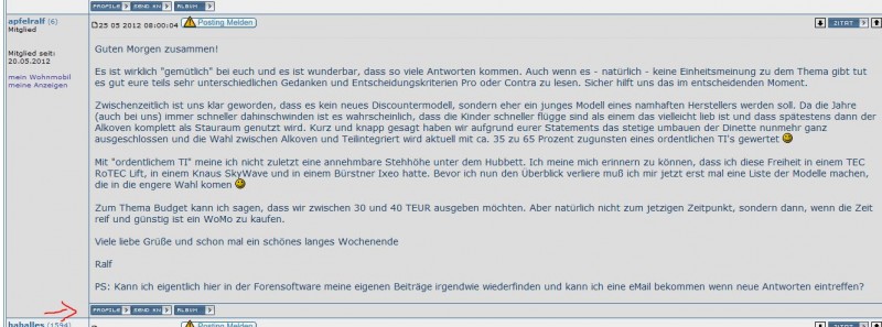 Es ist wirklich "gemütlich" bei euch und es ist wunderbar, dass so viele Antworten kommen. Auch wenn es - natürlich - keine Einheitsmeinung zu dem Thema gibt tut es gut eure teils sehr unterschiedlichen Gedanken und Entscheidungskriterien Pro oder Contra zu lesen. Sicher hilft uns das im entscheidenden Moment. Zwischenzeitlich ist uns klar geworden, dass es kein neues Discountermodell, sondern eher ein junges Modell eines namhaften Herstellers werden soll. Da die Jahre (auch bei uns) immer schneller dahinschwinden ist es wahrscheinlich, dass die Kinder schneller flügge sind als einem das vielleicht lieb ist und dass spätestens dann der Alkoven komplett als Stauraum genutzt wird. Kurz und knapp gesagt haben wir aufgrund eurer Statements das stetige umbauen der Dinette nunmehr ganz ausgeschlossen und die Wahl zwischen Alkoven und Teilintegriert wird aktuell mit ca. 35 zu 65 Prozent zugunsten eines ordentlichen TI's gewertet :-) Mit "ordentlichem TI" meine ich nicht zuletzt eine annehmbare Stehhöhe unter dem Hubbett. Ich meine mich erinnern zu können, dass ich diese Freiheit in einem TEC RoTEC Lift, in einem Knaus SkyWave und in einem Bürstner Ixeo hatte. Bevor ich nun den Überblick verliere muß ich mir jetzt erst mal eine Liste der Modelle machen, die in die engere Wahl komen :-) Zum Thema Budget kann ich sagen, dass wir zwischen 30 und 40 TEUR ausgeben möchten. Aber natürlich nicht zum jetzigen Zeitpunkt, sondern dann, wenn die Zeit reif und günstig ist ein WoMo zu kaufen. Viele liebe und schon mal ein schönes langes Wochenende Ralf PS: Kann ich eigentlich hier in der Forensoftware meine eigenen Beiträge irgendwie wiederfinden und kann ich eine eMail bekommen wenn neue Antworten eintreffen?