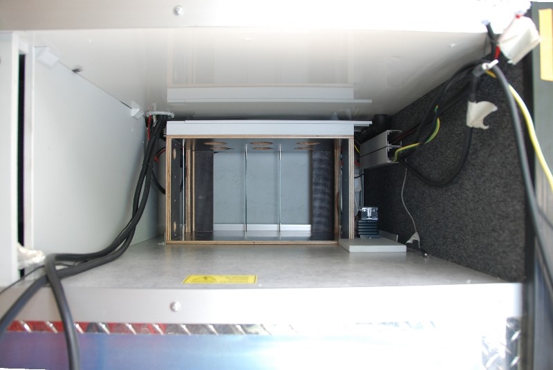 An der linken Wand steht die ca. 35 x 58 cm große Schalttafel, hier kommen Plus- und Minus-Kabel vom Akku an, von hier gehen alle weiteren Verbindungen ab.