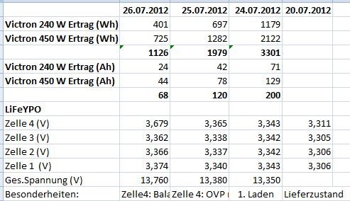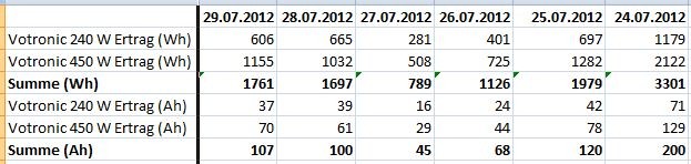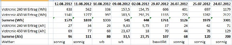 Der Tag danach zeigte es, 3300 Wh lieferten die Solarladeregler, die Akkus sind bei 13,5 V angekommen.