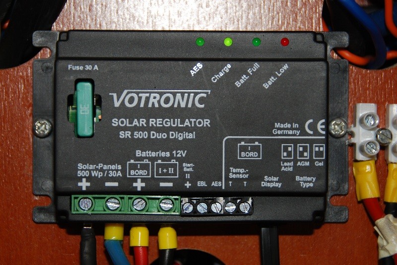 Alle Bauteile waren für den Einbau weitgehend vorbereitet, hier z. B. der zweite (linke) Votronic-Solarladeregler, an dessen Stelle vorher der originale cbm Solarladeregler gesessen hatte. Ganz links oben im Schaltschrank und ganz oben rechts auf Kühlkörpern die beiden Crydom SSRs, welche die Akkus vor Überladung schützen indem sie die Stromzufuhr von den Photovoltaik-Modulen vor den zwei Votronic-Laderegler unterbrechen.