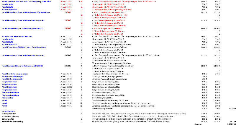 Ich habe meine Planungsliste der Realität angepasst und diese auf das reduziert, was mit dem Umbau von Blei auf die Winston LYP400AHA-Zellen bei mir im RV notwendig war. Darin enthalten ist auch ein Batteriemonitor, welcher sehr empfehlenswert, aber nicht unbedingt notwendig wäre, denn die Aufgabe eines BMS übernehmen die LIPRO1-1 Balancer.