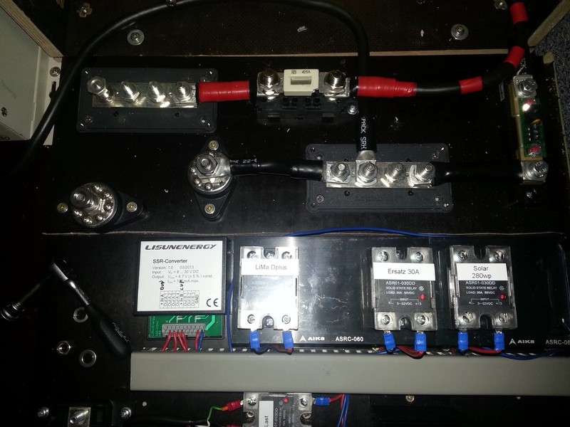 Doch es geht und man kann auch eine Überwachung einbauen: --> Link Hallo neo432! Ich lese eure Diskussion sehr sorgfältig weil ich die sehr interessant finde und weil ich demnächst auch eine LiFeYPO4 Anlage einbauen werde. Ich möchte mich nicht viel in eure Diskussion einmischen weil ich eigentlich aus ihren Erfahrungen weiter lernen möchte. Trotzdem, wenn es um D+ Signal geht, möchte ich erwähnen, dass D+ Signal nicht genutzt wird um nur Start- und Bordbatterie zu schlissen, sondern ansteuert ein par andere Relais wie z.B. Trittstuffe, oder 12V Kühlschrank Versorgung, Vorzeltleuchte, automatische Sat-Anlage (falls vorhanden) usw. Deswegen bin ich mir nicht so sicher dass richtiger weg ist, D+ Signal vom EBL einfach abzutrennen. Ich denke dass es andere Möglichkeiten gibt um Problem zu lösen. Übrigens, D+ Signal kannst du finden am Verteilermodul „DS-340HY“, am Stecker Nr.:20., Pin 1. und abtrennen wenn du meinst dass das richtig ist. So viel von mir. Ich werde eure Diskussion weiter beobachten und bin gespannt wie es weiter geht. aus Belgrad Gordan Hallo Gordan, D+ ist für mich nicht die erste Wahl. Da vieles andere auch daran hängt, zb meine Internet-SAT Schüssel. Aber auch, weil ich bis jetzt 11:30 Uhr am 19.05.2013 nicht weis wie ich an D+ komme, da auf dem DS-340 Anschluss NR 20, optional ist. Ich fahre gleich zum Womo weiter basteln. Daher mein Einfall, das EBL über zwei Plus-Kabel (OVP/LVP) mit 50A Dioden anzuschliesen und damit den Weg des Plus-Stroms zu lenken. Nur leider konnte mir noch niemand wirklich sagen, warum das nicht funktionieren soll. Mag mir jemand seine 2ct nur zu diesem Punkt schenken? Danke aus HH, René So bin gerade im Womo. Bevor ich die Brücken über die Zellen setze, bin jetzt auf der Expedition nach D+. Meine Blei-Akkus sind abgelemmt. Nun ab ich die Zündung an geschaltet und hinten im DS-340 EBL klackert es wie wild. Scheint ein Relais zu sein. Jemand eine Idee warum das Relais klackert ohne die Blei-Akkus dran? Idee mit Dioden kann ich nicht nachvollziehen und denke dass mit SSR DC-DC, fast alles außer Netzladegerät Abgeschaltet/geregelt werden kann, wo ich auch wieder ein SSR DC-AC nehmen werde. Oder ich habe was eventuell übersehen? Signal D+ außer am Anschluß Nr.: 20. und Nr.: 15. (beide optional) gibt’s auch am Anschluß Nr.: 7. (Kühlschrank). Aus Bildern kann ich aus der Ferne nicht mehr sehen weil es sich nicht um echten Schaltplan handelt. Bei mir ist ein Schaudt EBL eingebaut, im Prinzip gleich, aber etwas einfacher und übersichtlicher und vor allem ich habe alle mögliche Schaltpläne und Zeichnungen. Ich halte dir die Daumen dass du das schnell hin bekommst! nach HH Gordan Gordan, die beiden Plus-Verbindungen mit den Dioden gehen jeweils auf ein OVP-SSR (OverVoltageProtection) und den LVP (LowVoltageProtection) TSA-260.