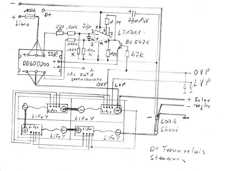 Sonnentau3 hatte geschrieben: "Vorsicht mit irgendwelchen Dioden!!! Diese bringen nichts weil man ja damit auch nichts verhindern kann,was man abschalten möchte. Daher alle Last über den SSR LVP und alle Ladequellen OVP an den schwächesten Stellen abschalten. Z.B. Solar vor dem Laderegler in der Plusleitung vom Modul zum Laderegler.Netzladegerät in der AC Zuleitung mit einem DC_AC SSR oder bei kleinen Ladegeräten in der DC + Ladeleitung. Lima über D+ des Trennrelais."