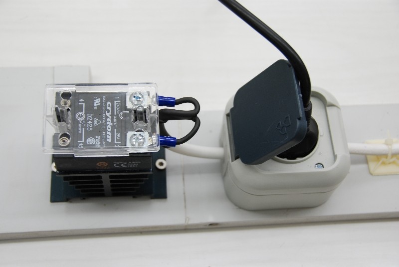 Wer die Sicherung für das 230 V Ladegerät, oder das Ladegerät selber ausfindig gemacht hat, kann diese Leitung doch anzapfen und über ein SSR laufen lassen. Die Leistung der hier mehrmals erwähnten 20A Sicherung schafft ein entsprechendes SSR doch locker. Manche Ladegeräte verfügen auch über einen Fernsteuerungsanschluss. Da könnte im Einzelfall geprüft werden, ob man das über ein SSR laufen lassen kann. Ich habe kurzerhand ein 230 V Wechselstrom-SSR mit 12 V Gleichstromsteuerung in die 230 V Zuleitung zu meinem Ladegerät eingebaut - einfach und effektiv. Das sieht dann so aus: Der Stecker ist vom 230 V Ladegerät. Da es derart viele unterschiedliche EBL´s gibt, wird es eine Lösung für alle kaum geben. Vielleicht stellten andere Umrüster ihre diesbezügliche Lösung hier auch ein.