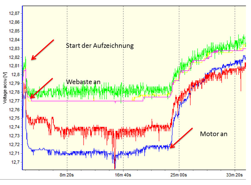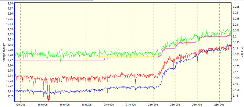 Ich habe ein Solaranlage die bis zu 40 A leisten könnt. Warum soll ich Balancer verbauen, die 40 A vernichten könnten. 3,65 V mal 4 ist 14,6 V, eine Spannung die ich nicht ereichen werde. Jeder Lader regelt vorher runter. Hier noch ein Problem was ich nicht so richtig erkenn. Hier wurde das Starten des Motor als sehr kritisch gesehen, wenn D+ schaltet. Ich habe heute die Daten mitgeloggt: ![]() Aber nicht pro Zelle.Es geht nicht um die gesamte Spannung,sondern um die einzelne Zellspannung! Ich habe vor 6 Wochen bei einem 90 Ah Block mit einem Ladegerät von 5 A und Abschaltspannung 14,6 Volt eine Zelle gehimmelt ,weil ich zu faul war bei der Erstaufladung die Lipros anzuschliesen .Das erstaunliche dabei war,das es sich eigendlich um einem selektierten Block handelte welcher eigendlich ohne Balancer auskommen sollte.Passiert mir nicht mehr !