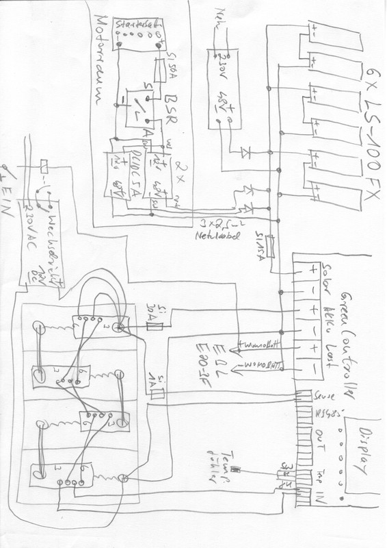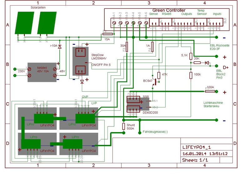 ![]() Hallo Eric, diese Schaltung hatte ich 5 Monate im Einsatz. Der BC547 verknüpft D+ und OVP für das SSR um die Ladung der Batterie bei laufender Lima anzusteuern. Out1 des GreenControllers schaltet das SSR ab wenn eine vorgegebene Spannung am Aufbauakku erreicht ist. Out2 schaltet den Ladewandler für die Starterbatterie bei einer einstellbaren Spannung der Solarpaneele zu. Uwe Hallo KaeptnBlaubaer, meine Idee war eigendlich ,das alles auch mit der vorhandenen Technik funkltioniert.Selbst ein einfacher Solarladeregler funktioniert ohne Probleme. Die Balancer sind jetzt lackiert.Auch für das Tsa 265 benötigt man ein kleines SSR zur Ansteuerung.Kommt bald als fertiges Modul.Der SSR Converter ist ein Produkt welches auf die billigen SSR eingestellt wurde ,damit diese bei kleiner Ansteuerung laufen(Ich hatte nämlich Probleme ohne diesem Converter das die SSR nicht sauber durchgeschalten hatten) Ohne Converter verbrauchen diese einfach zu viel Strom.Ein weiterer Vorteil ist,das alles in einem Gerät ist,was die Verkabelung und die Fehlerfindung erheblich verbessert.(Der Erlös des SSR Converter kommt zu 100 % einem Kindergarten zugute,der von mir eine komplette Solaranlage gesponsert bekommen hat) Der erste Schritt in die LiFeYPO4-Welt ist getan: ![]() Ja ,die guten alten Ev-Power Module mit den bei mir alles begann. Vorsicht nur mit der Ladung ohne Abschaltmodul,da der kleine Balancerstrom sehr schnell überschritten werden kann. Auch zu bedenken ist,das es nur eine Abschaltmöglichkeit für Ladung und Entladung gibt.Bei Tiefentladung muß dann mittels Reset das System zurückgestellt werden!! Viel Freude mit dem neuen Akku und denke daran: der Strom ist wirklich gelb :mrgreen: