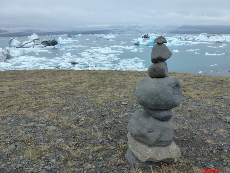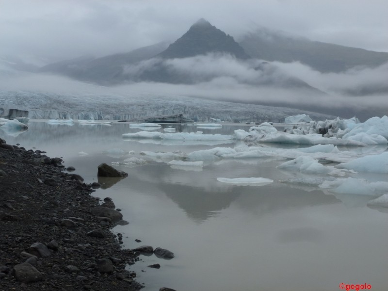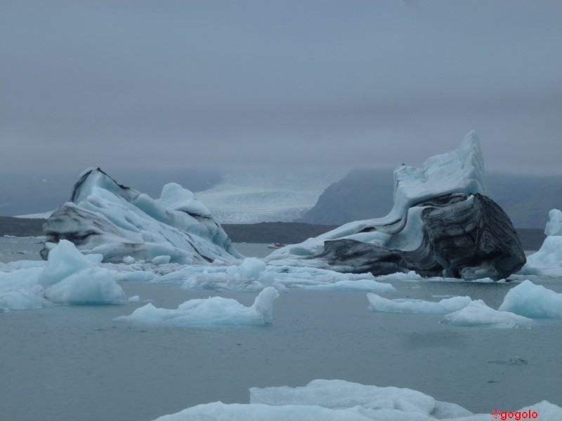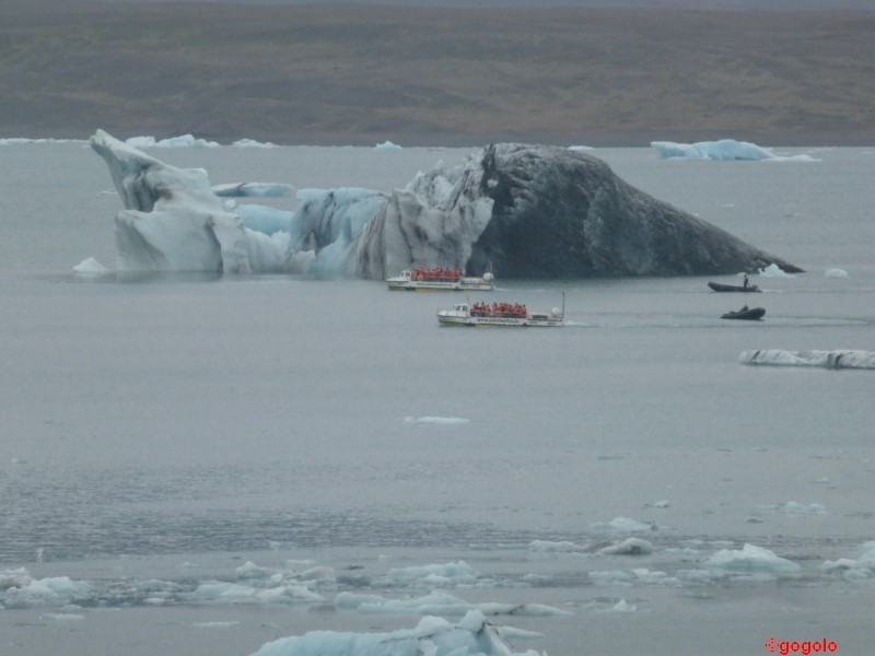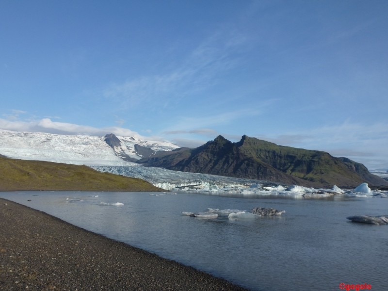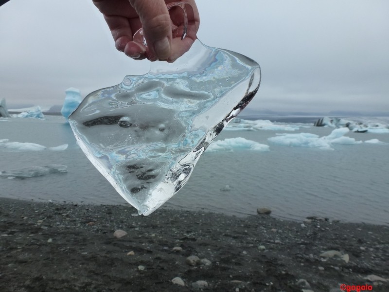 Die Eisberge, die im Wasser schwimmen haben ein Alter von rund 2000 Jahren und das Eis schillert von rosa über weiß bis zu hellblau. Die Eisstücke, die ans Ufer geschwemmt werden sind glasklar und total durchsichtig. Gibt man sie in ein mit Wasser gefülltes Glas werden sie „unsichtbar“. Vor 2000 Jahren gab es halt noch keine Umweltverschmutzung…