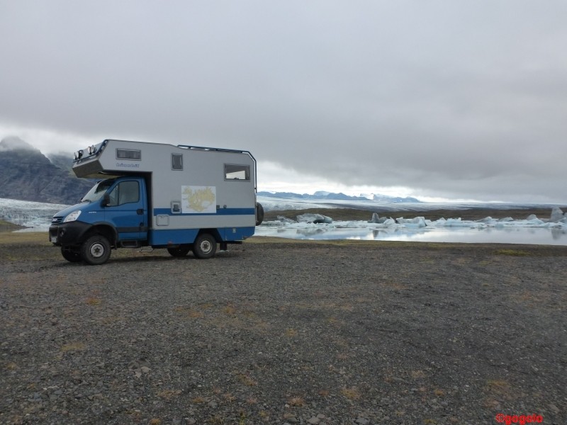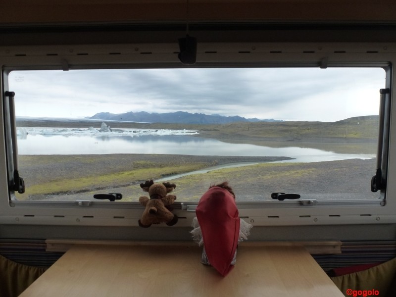 Einige Kilometer weiter ist der “Touristeneissee“, wo die Leute mit Amphibienfahrzeugen durch die schwimmenden Eisberge gekarrt werden. Hunderte von Autos und Busse bevölkern den Parkplatz. Gut an diesem Platz ist nur der kleine Imbiss, wo es frische Waffeln mit Rhabarbermarmelade und Schlagsahne gibt. Diese See ist zwar auch schön anzusehen, aber der Rummel ist nichts für uns!