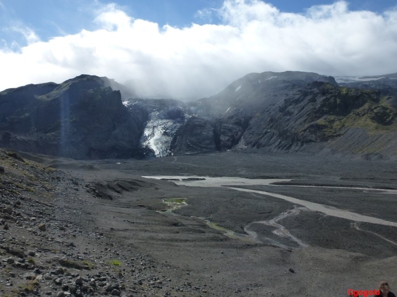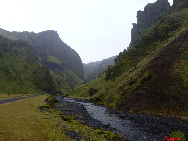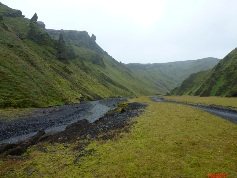Kurz nach Vik führt uns eine Stichstraße an den Fuß des Vulkans Katla nach Þakil. Eigentlich ist die Katla ein sehr gefürchteter aktiver Vulkan, dessen nächster Ausbruch schon lange überfällig ist. Aber er hat still gehalten in der Zeit, wo wir in dem Tal über Nacht standen. Es ist schon ein eigenartiges Gefühl, zu wissen dass der Vulkan jederzeit ausbrechen könnte. Das Tal in dem Þakilar liegt ist wunderbar grün mit bizarren Felsen und man kann sich leicht vorstellen, wie toll das bei gutem Wetter aussehen würde… Þakil: