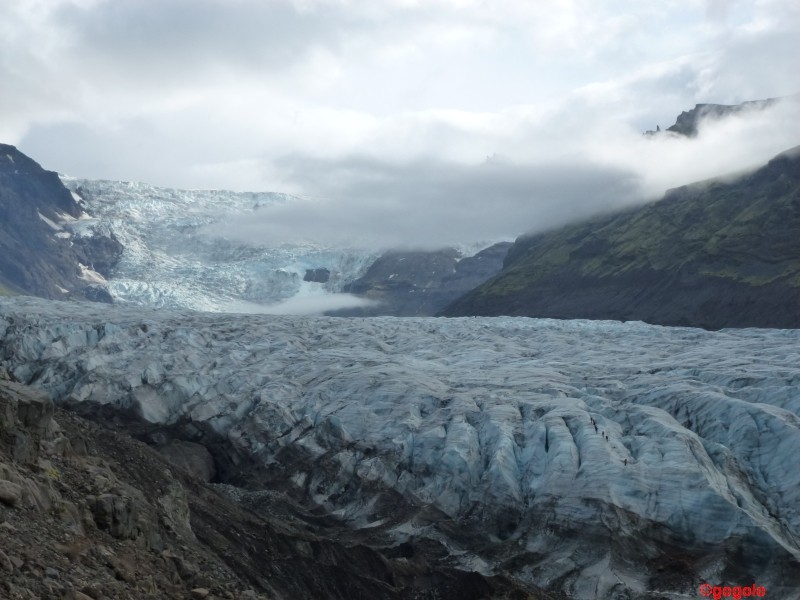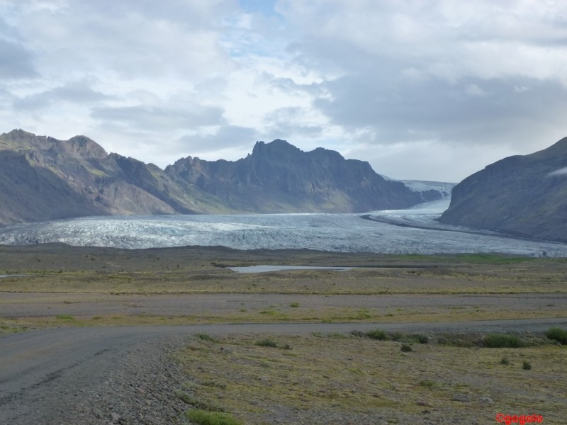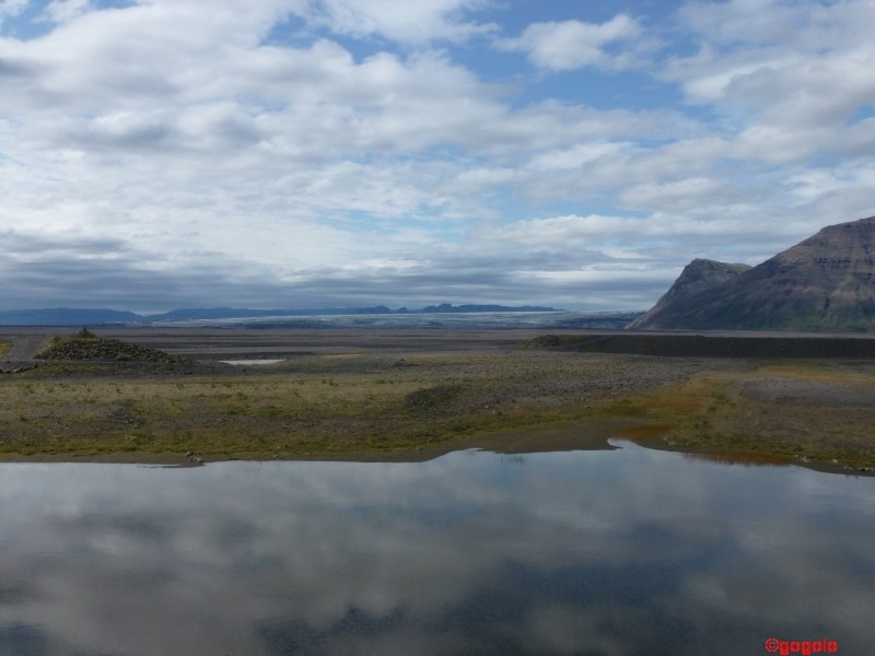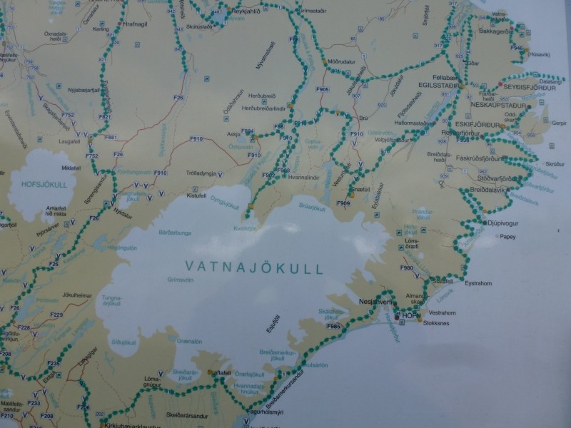 Europas größter Gletscher (wenn man von Spitzbergen absieht) ist der Vatnajökull (sprich: vahtnajœkytl) an der Südküste mit 8.100 km². Seine Eiskappe ist bis zu 1000 m dick, er ist doppelt so groß als alle Alpengletscher zusammen, hat insgesamt über 3.000 km³ Eis-Volumen. Unter dem Eis sind drei aktive Vulkane, die gelegentlich ausbrechen… Und er ist prächtig anzusehen. Wenn man sich Zeit lässt kann man an der Südküste Islands einen ganzen Tag lang am Gletscher vorbeifahren und hat immer wieder neue Perspektiven. Hinzu kommt, dass auch das Wetter sich wieder langsam bessert.