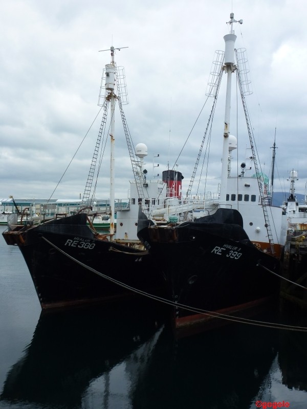 Zu erwähnen ist auch noch der Hafen. Leider hatten die Fischfabriken (sie können besichtigt werden) geschlossen, weil wir an den Tagen des Handelsfeiertages (1. Wochenende+Montag im August) in Reykjavik waren. Da haben alle Geschäfte und Fabriken geschlossen. Es empfiehl sich übrigens an diesen Tagen nicht in den Erholungsgebieten zu sein, da die Isländer dieses Ereignis ausgiebig mit viel Alkohol und lautstark feiern. Deswegen haben wir auch geschaut, zu diesem Termin in der Hauptstadt zu sein – da war es fast wie ausgestorben. Einige Schiffe der Walfangflotte liegen immer noch im Hafen, bereit jederzeit nach Bedarf auszulaufen.