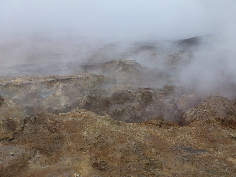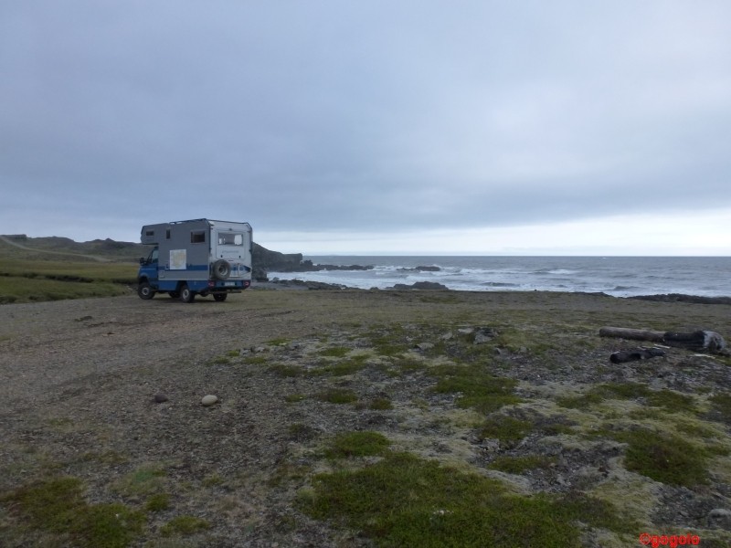 Jetzt wird das Wetter allmählich schlechter und wechselhaft. Insbesondere fängt der isländische Nieselregen manchmal an. Generell ist ja zu sagen, dass das Wetter im Süden der Insel schlechter (nässer) ist als im Norden. Mit einer raschen Besserung ist nach Auskunft des Wetterdienstes im Internet nicht zu rechnen. Müssen wir halt das Beste aus der jeweiligen Wettersituation machen. Weiter südlich von Garður ist noch ein Kap zu besichtigen mit einer Vogelkolonie und einer schönen Brandung. Wir konnten mit dem Gogolobil bis knapp an die Abbruchkante fahren und dort ganz einsam übernachten. In der Nacht war dann die Brandung so laut, dass ich nur mit Ohrenstöpsel schlafen konnte. In der Nähe ist wieder die Kontinentalspalte deutlich zu sehen und auch ein Gebiet mit heißen Schlammlöchern „Gunnahver“ befindet sich dort. Mit der geothermalen Energie wird in einer großen Fabrik Salz gewonnen.
