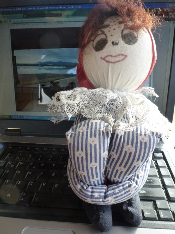 Nein, das ist kein Troll, das ist unsere "Püppi". Püppi begleitet uns schon seit über 20 Jahren auf unseren Womo-Reisen - früher im alten umgebauten Hanomag AL28 - und war jetzt auch schon 4mal in Island (ist also fast schon eine "Eingeborene"). Püppi hat meine Schwiegermutter uns als Talisman/Talisfrau gebastelt. Das ist unsere Püppi: