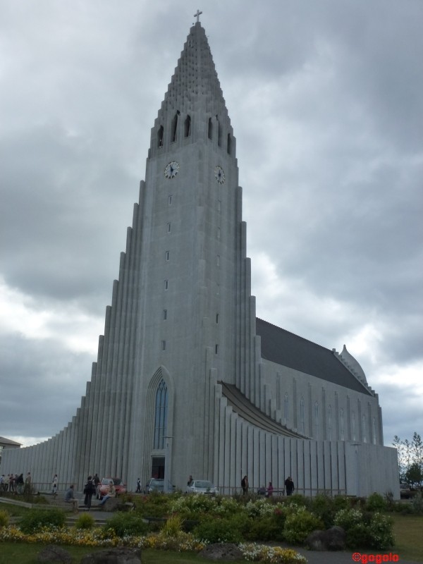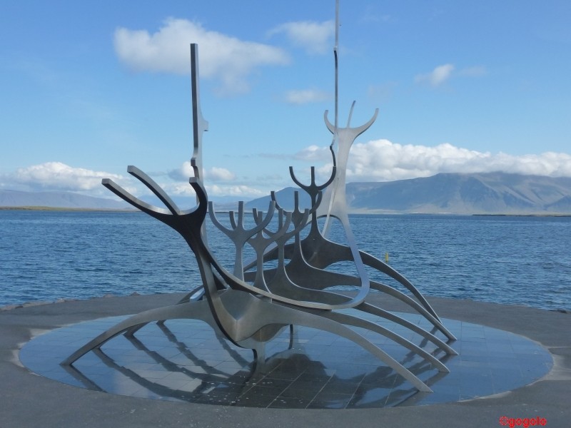 Wir kommen bei anhaltend gutem Wetter von Þingvellir nach Reykjavik, der Hauptstadt Islands. Dort in der Hauptstadt (01.01.2012: 118.814) lebt mehr als die Hälfte der Bevölkerung des Landes (01.01.2012: 319.575) – das bedeutet (und das habe ich ja schon angedeutet) dass „auf dem Land“ eine sehr niedrige Bevölkerungsdichte ist. Andererseits muss man sich im Hauptstadtgebiet von der Vorstellung „Natur pur“ verabschieden. Dafür gibt es dort alles an Dienstleistungen, was man sich nur so vorstellen kann. Ein riesiges Einkaufszentrum namens „Kringlan“ in dem es alles zu kaufen gibt was das Herz begehrt. Das Einkaufszentrum Kringlan hat sogar ein Parkhaus in dem Wohnmobile bis zu einer Höhe von 3,50m hineinfahren können (ich habe mich mit dem Gogolobil bei 3,45m aber nicht getraut!) Am großen städtischen Schwimmbad ist auch gleich der Campingplatz gelegen, den man wohl oder übel aufsuchen muss. Die Ent- und Versorgung von Wohnmobilen kann kostenlos bei der städtischen Kläranlage erfolgen) Am Strand ist gleich eine wunderschöne Skulptur zu sehen – sie soll ein Wikingerschiff darstellen:
