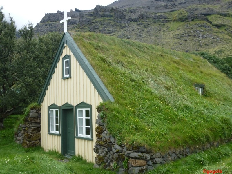 Ganz nah können wir mit dem Gogolobil an eine der vielen Gletscherzungen heranfahren und die Eismassen bewundern. Auf der Weiterfahrt entdecken wir in Hof i Öræfi eine der ältesten Torfkirchen Islands, sie ist immer noch aktiv in Betrieb. Die gesamte Gegend war bis vor rund 30 Jahren ziemlich vom übrigen Land abgeschnitten, erst mit dem Bau der Ringstraße wurde eine gefahrlose Verbindung nach Ost und West möglich.