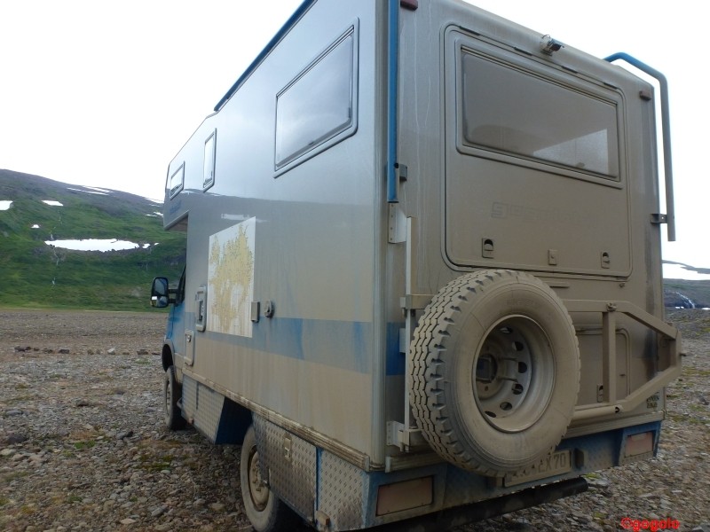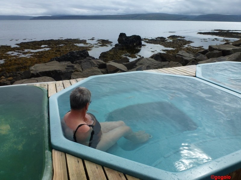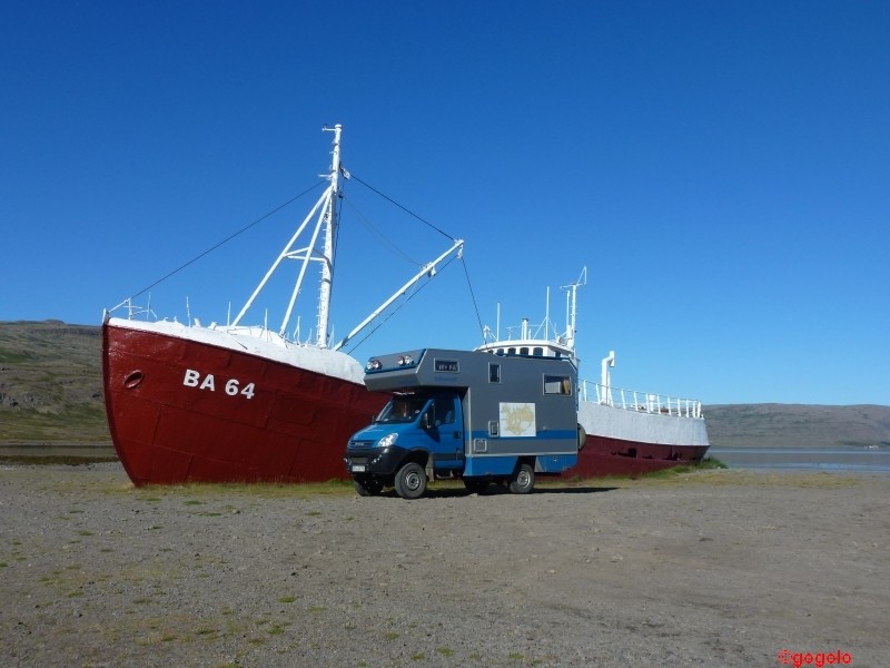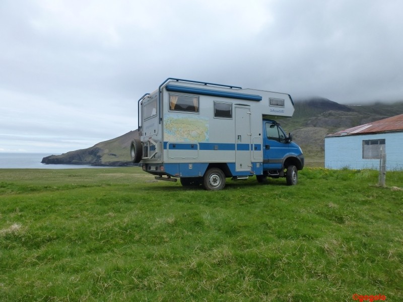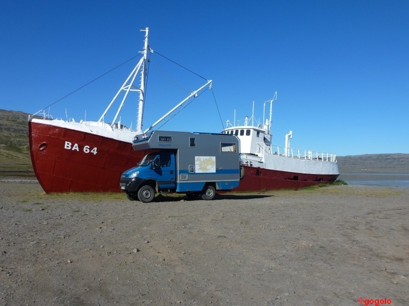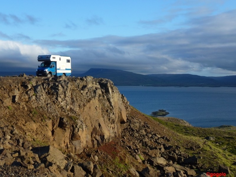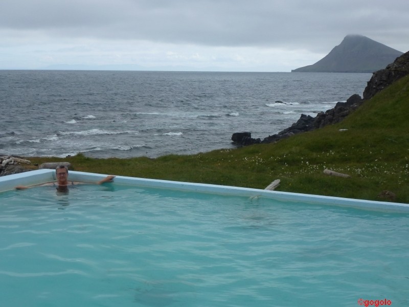 Wir beginnen an der Ostseite der Westfjorde und fahren so weit wie möglich nordwärts über Drangsnes bis es in Krossnes nicht mehr weiter geht. Beide Orte haben ein sehens- und erlebenswertes Freibad. Man sitzt fast direkt im Atlantik bzw. kann aus dem heißen Wasser wunderbar aufs Meer schauen. Solche traumhaften Bäder habe ich noch nirgends erlebt, sie sind aber in Island gang und gäbe und in sehr, sehr vielen Orten vorhanden. Wenn man mit dem Womo frei steht und die eigene Dusche bzw. Wasservorräte schonen will, dann geht man halt in ein solches Bad. Das ist auch viel kommunikativer als alleine zu duschen… Auch wundschöne Übernachtungsplätze für das Gogolobil und uns gibt es zuhauf. Aber wenn die Gravelroads durch Regen nass und schlüpfrig werden, dann schaut das Gogolobil auch entsprechend aus – gottseidank hat fast jede Tankstelle eine Waschmöglichkeit, bei der das Fahrzeug wieder sauber gemacht werden kann.