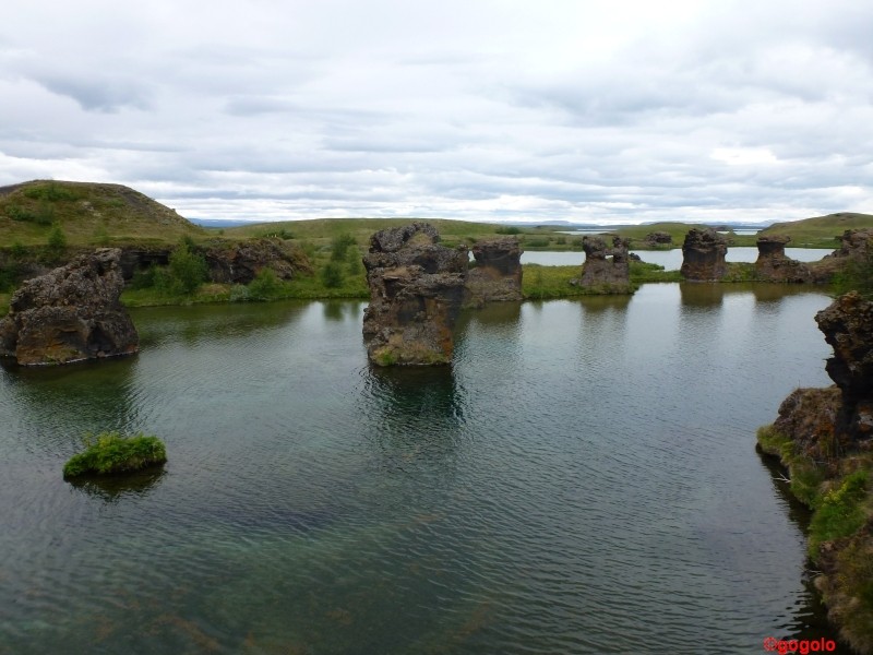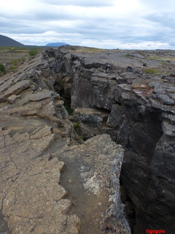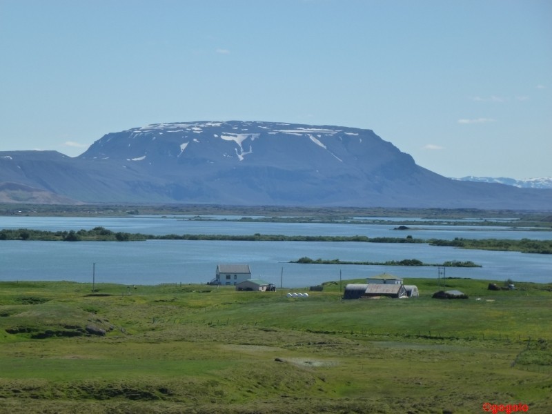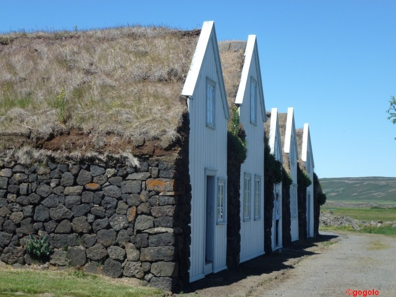 Auch der Myvatnsee, der aktive Vulkan Krafla (dort ist auch ein Goethermal-Kraftwerk) und das Solfatarengebiet von Namaskard sind bei jedem Islandsbesuch ein „Muss“. In der Nähe des Myvatnsees kann man auch gut das auseinanderdriften der europäischen und amerikanischen Kontinentalplatten sehen. Die Drift beträgt jährlich rd. 2cm und zieht sich durch das ganze Land. Entlang dieser Driftzone sind auch die meisten isländischen Vulkane angesiedelt. Grashäuser eines Museums: