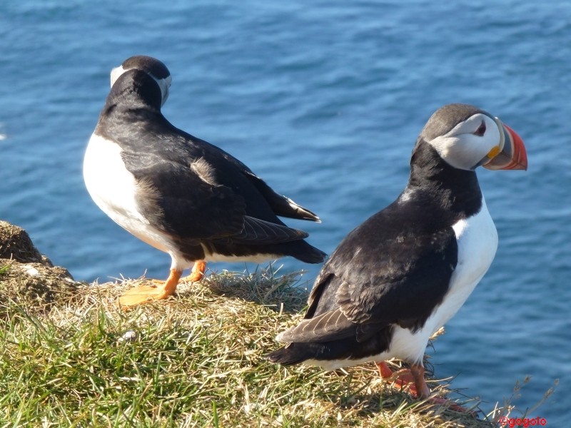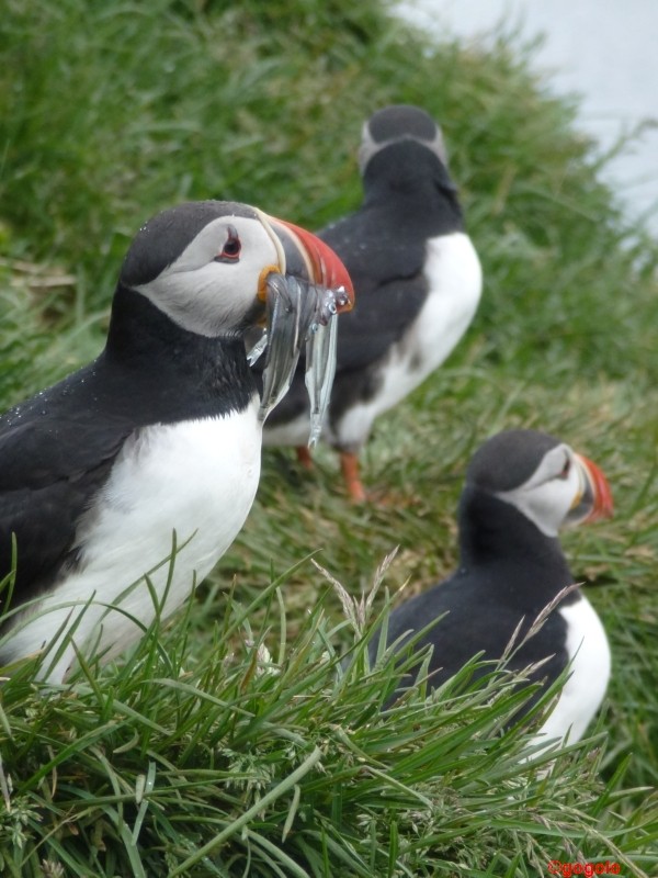 Auch die ersten Papageitaucher (Lundis) kamen mir vor die Linse. Es sind schon sehr, sehr putzige, possierliche und fotogene Tierchen, die gerade ihren Nachwuchs mit Sandaalen, den kleinen Fischchen, in Bruthöhlen großziehen. Aber nicht nur Papageientaucher, sondern auch Eissturmvögel, Dreizehenmöven, Trottellummen, Seeschwalben, und Tordalken sowie Eiderenten waren zu sehen. Lundis/Papageientaucher: