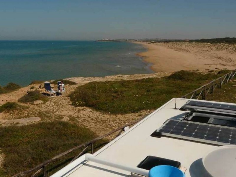 Am 02.05. stehen wir bereits den 4. Tag auf dem Felsplateau oberhalb des Strandes Spiaggia di Randello in Punta Bracetto. Die Tage vorher waren mehrere deutsche und italienische Camper da, die Italiener versorgten uns sogar mit Kuchen. Heute sind wir allein, alles absolut leer, kein Angler, niemand. Übersichtliches Gelände. Wir sitzen max. 15m neben dem Fahrzeug auf der der Aufbautür abgewandten Seite, genau so wie auf dem Dachfoto zu sehen.